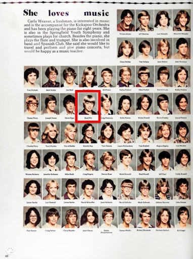 Actor Brad Pitt was born in Oklahoma, but grew up in Springfield, Missouri. He attended Kickapoo High School, and we found 2 photos of him in the 1979 yearbook. He was around 16 years old at the time. According to his biography, he got good grades and acted in school plays and musicals.