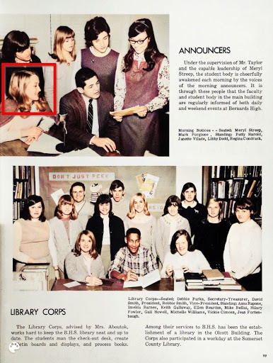 Meryl Streep, one of the most beloved American actresses of all time, was born Mary Louise Streep in Summit, New Jersey. She showed a talent for the performing arts at an early age, and her yearbook entries from Bernards High School show how involved she was in cultural activities at the school.