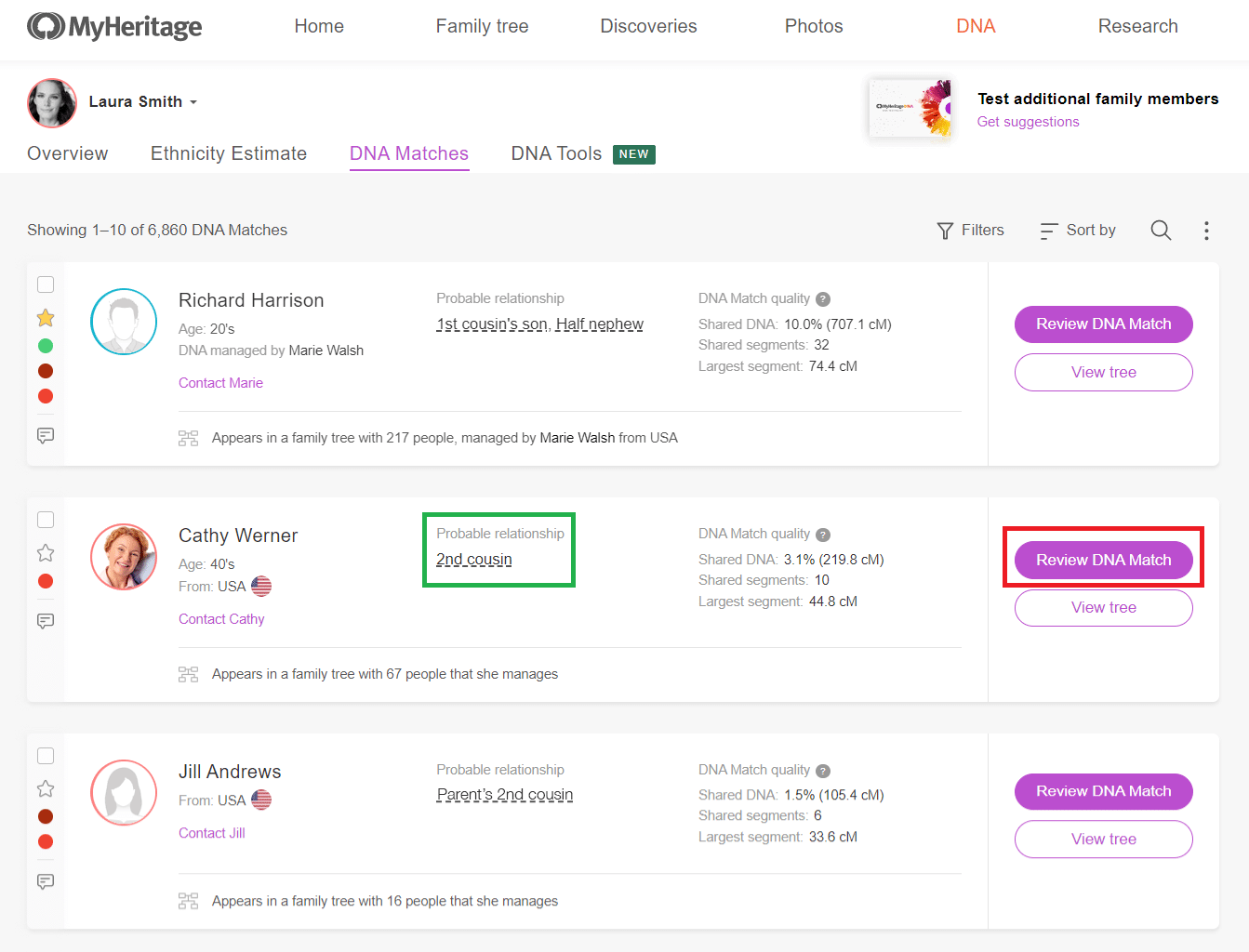 The page lists all your DNA Matches. Each DNA Match card shows one or more probable relationships between you and a match. This replaces the broader range of “Estimated relationships” that previously appeared.