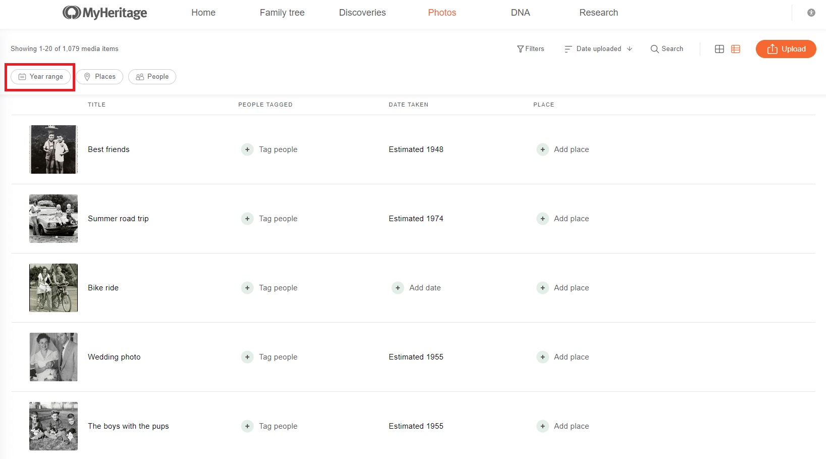 To use PhotoDater, visit MyHeritage and click “Photos” in the main menu. If you have undated photos that aren’t on MyHeritage yet, upload them first to receive PhotoDater
