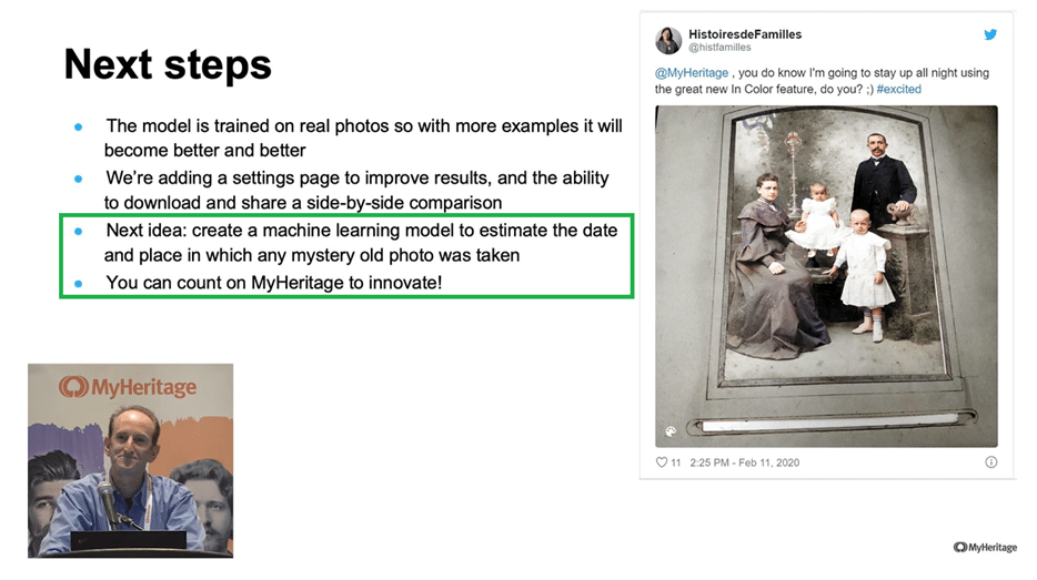 is a stunning addition to the suite of photo tools offered by MyHeritage. It’s a good first step when trying to understand a photo mystery.” Thomas MacEntee of Genealogy Bargains says, “MyHeritage keeps finding fantastic ways to harness the power of AI for practical genealogical use. PhotoDater