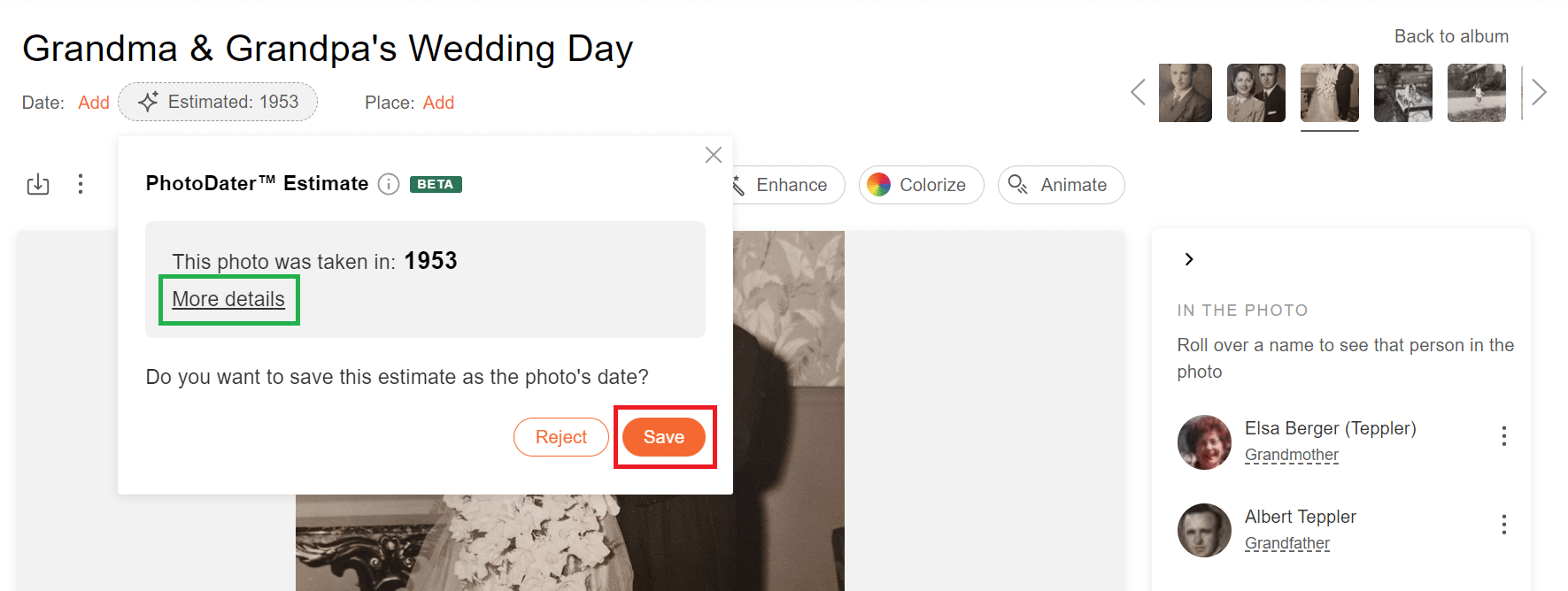 The algorithm provides date estimates for undated photos taken between 1860 and 1990, for which it is reasonably confident it can return results with high accuracy. Estimates are calculated only for photos that do not already have a date in the metadata, that include people, and that are actual photographs, not documents or gravestones. A photo of just a car or a scan of a historical record won’t receive a date estimate. Date estimates can be reviewed and saved by you to the photo’s metadata, or dismissed. If you prefer not to see any date estimates, you can turn off PhotoDater from the site settings menu.