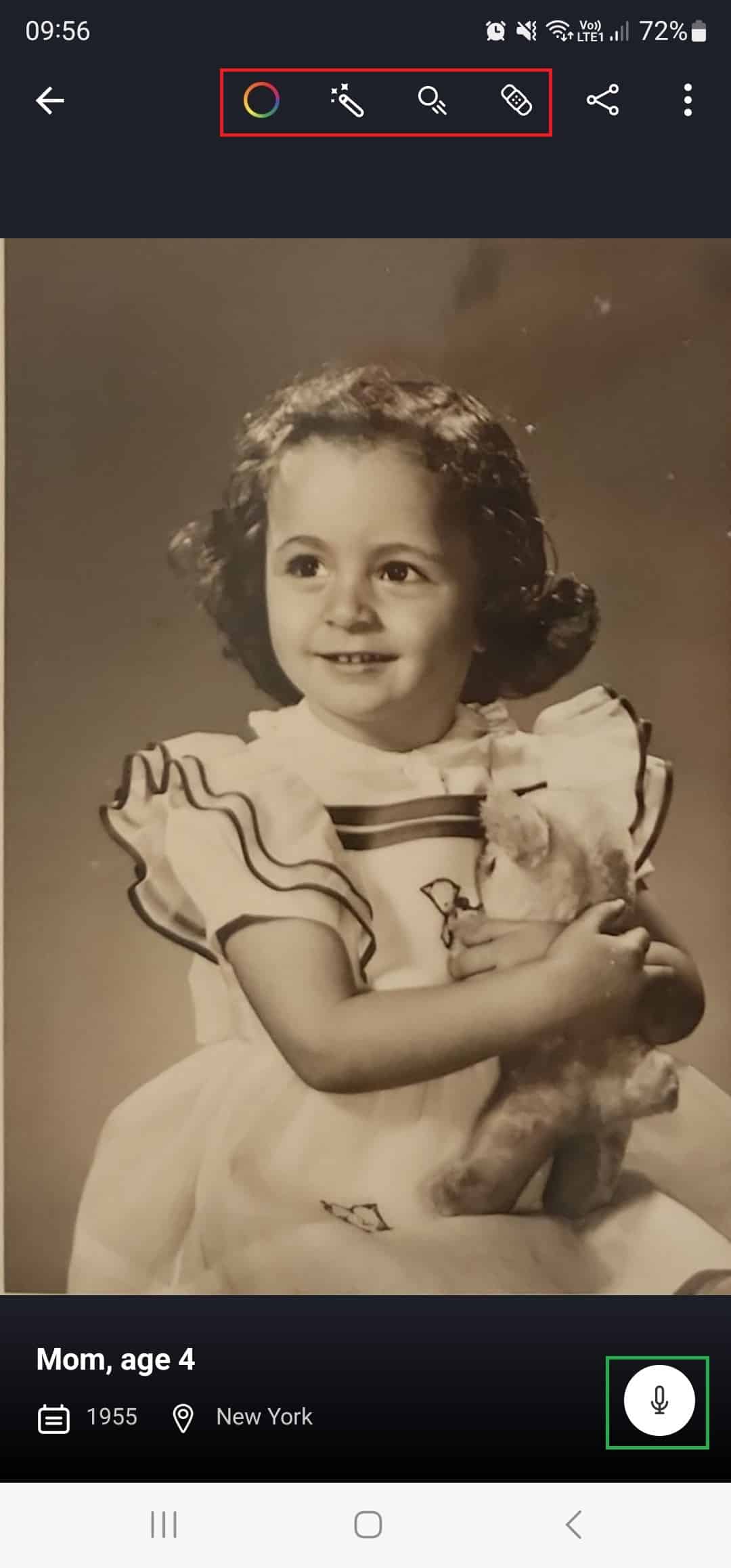 The color wheel icon performs two different functions, depending on the original input photo. If the original is black and white, tapping the icon colorizes the photo. If the original is a color photo that faded over time, as often happens with photos from the 70s, 80s, and 90s, the faded colors are beautifully restored. If the colors are already perfect, no changes will be noticeable. Color restoration is a unique feature that’s only available on Reimagine and MyHeritage.