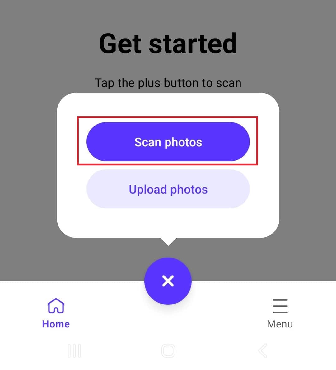 To add photos from your device, tap “Upload photos” and follow the instructions on the screen. To scan photos or albums, tap “Scan photos.”