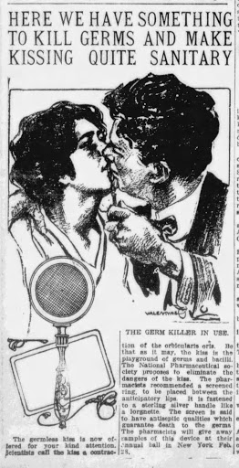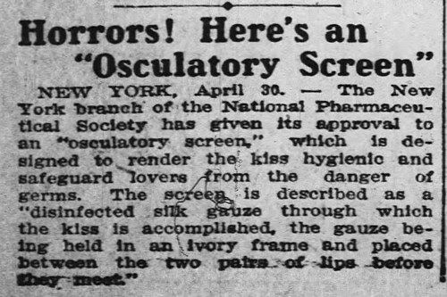 As awareness of germ theory grew, people began to understand that disease could be spread through kissing. Almost a decade before the Spanish flu broke out, a product called an “osculatory screen” was approved by the National Pharmaceutical Society: