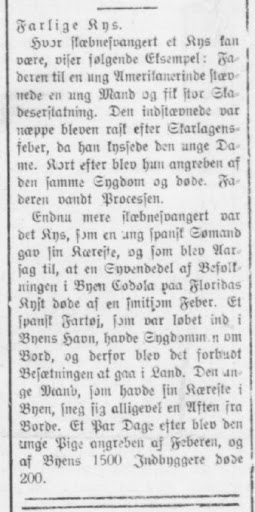 This article from a Danish newspaper, Middelfart Avis, published December 8, 1918, is titled “Dangerous kisses.” It discusses how critical it is to avoid kissing, bringing an example of a ship from Spain that brought the fever to the coast of Florida. Crew members were forbidden from going ashore, but one man snuck out to meet his girlfriend in the town. A few days later, she got the flu, and 200 of the town’s 1,500 people ended up dying from it.