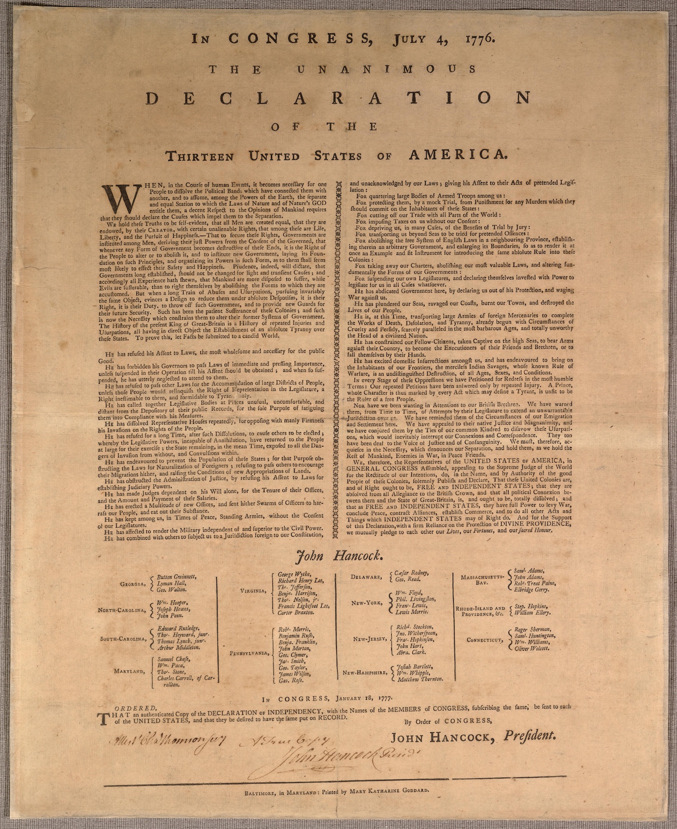 In January 1777, the Continental Congress moved to make the Declaration of Independence more widely distributed. After recently evacuating to Baltimore to escape the British Army, the Continental Congress commissioned Mary Katharine to print a new broadside. Unlike the Dunlap broadside, the new print would include the typeset names of the signers of the Declaration of Independence. It would be the first time their names were made public in print. Notably absent from the list is Thomas McKean, who likely signed the document at a later date.