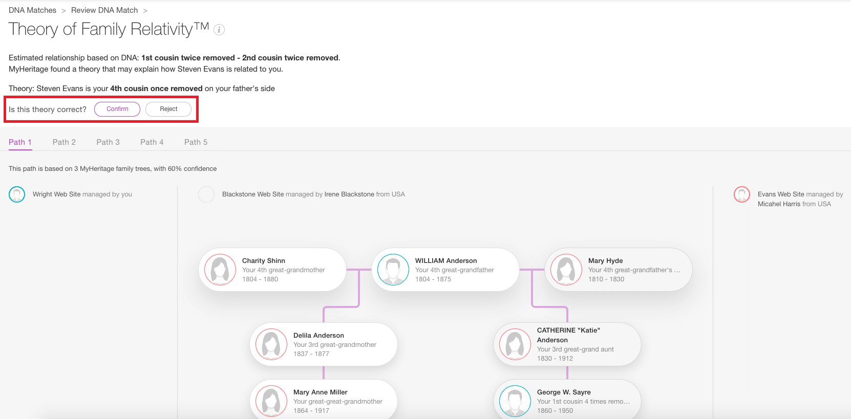 If the theory appears to be correct, you can click the purple “Confirm” button above the relationship path chart. If it appears to be incorrect, you can click “Reject.” Your confirmation or rejection of the theory will then appear in the DNA Match’s card in your list. (You can always undo this action if you make a mistake.)
